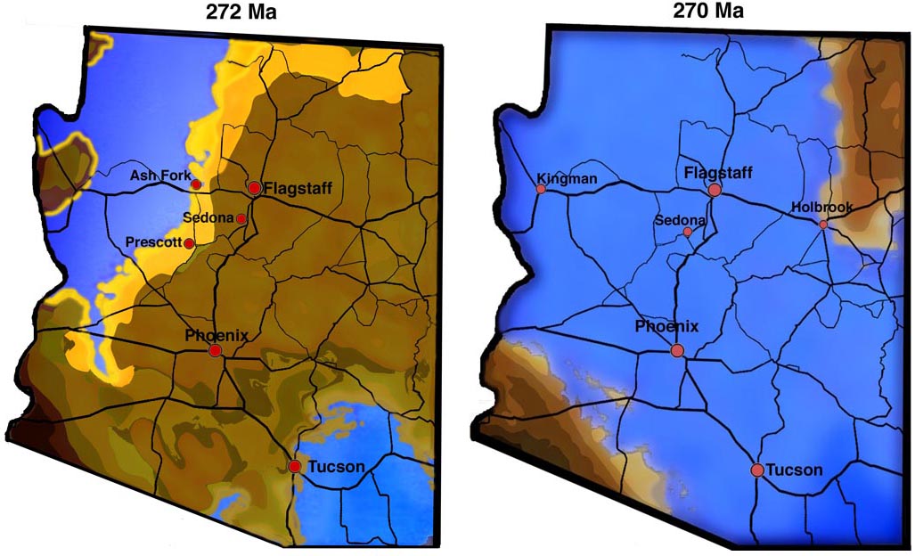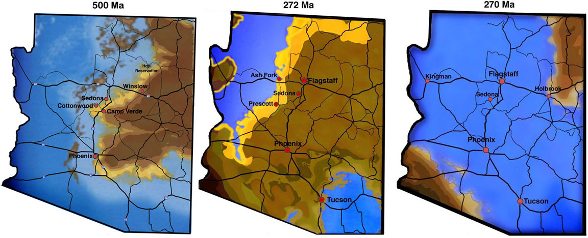 Arizona was a shallow ocean during both the Cambrian Explosion of Life ~ 500 Ma and during the Permian Explosion of Life ~ 250 Ma.
