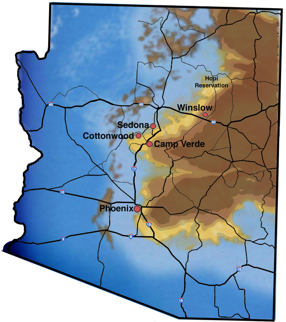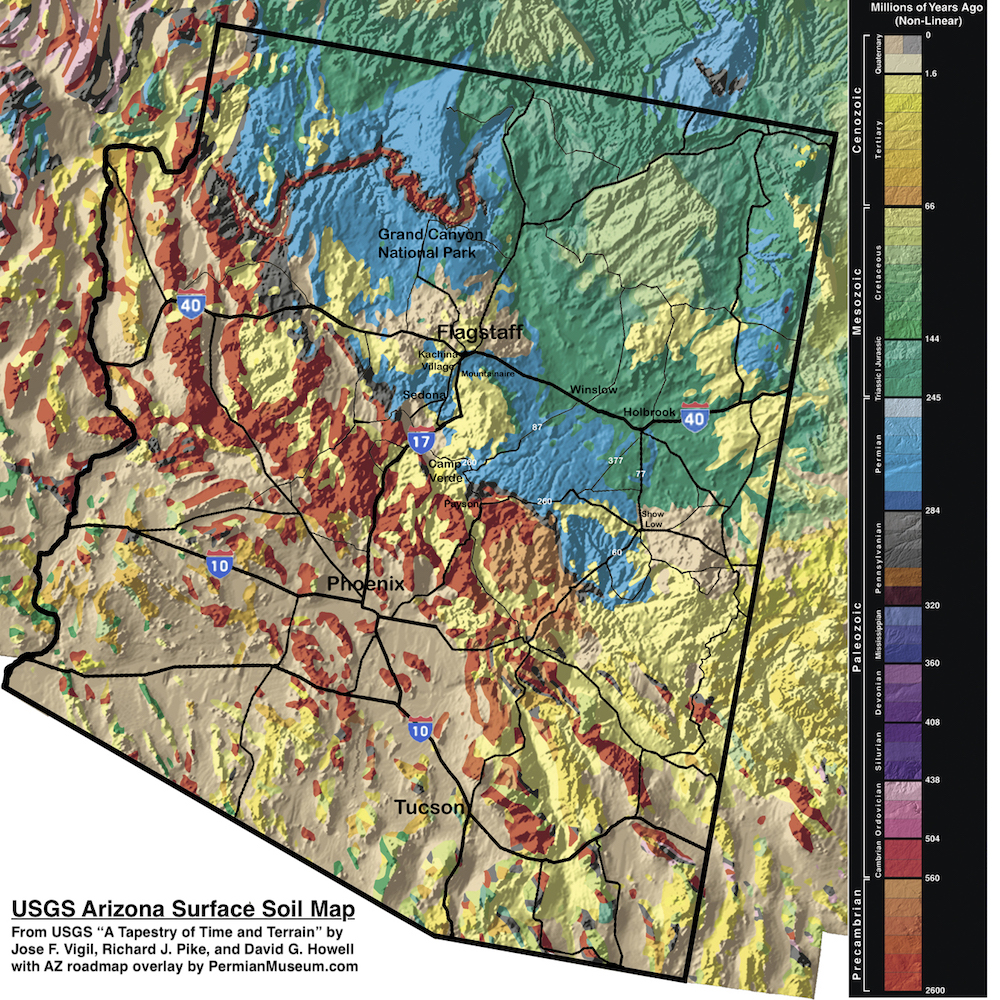 The USGS surface soil map, combined with a current Arizona road map, is shown below. Both Cambrian and Permian fossils can be found at the surface in large parts of Northern Arizona (in red and blue, respectively).