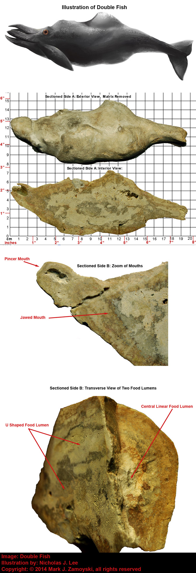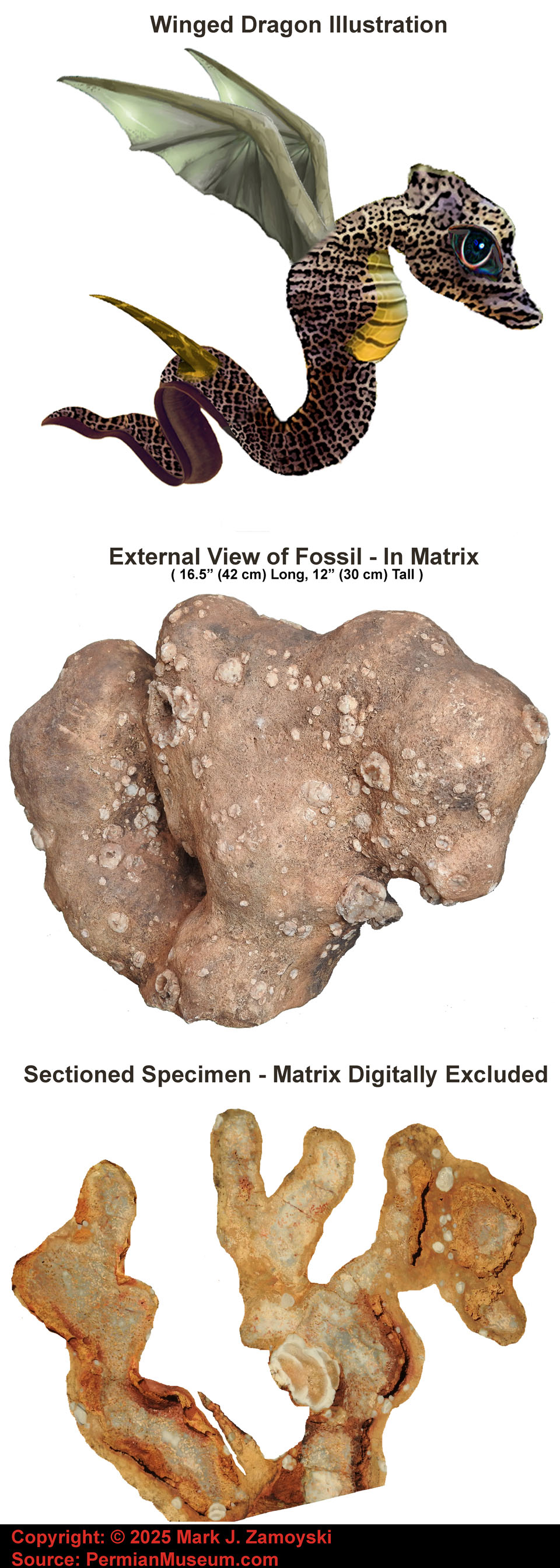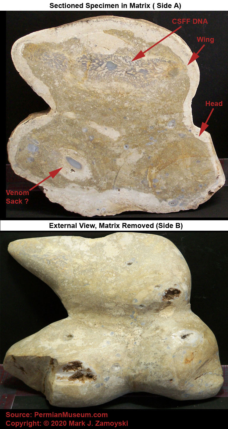 As for the tissue preservation aspect of the discussion, it should be noted that the sectioned specimen of Whaleen above shows what appears to be gestating progeny in an isolated sack in the central food lumen (more typical of a nematode). The progeny have been preserved in crystalline form, versus the rest of Whaleen, which has been preserved as hardened calcium carbonate. This aspect of the soft tissue preservation is not yet understood, as undigested stomach contents in specimens such as Zamoyski dragon are not preserved in crystalline form, but as hardened calcium carbonate, just like the remainder of the life form: