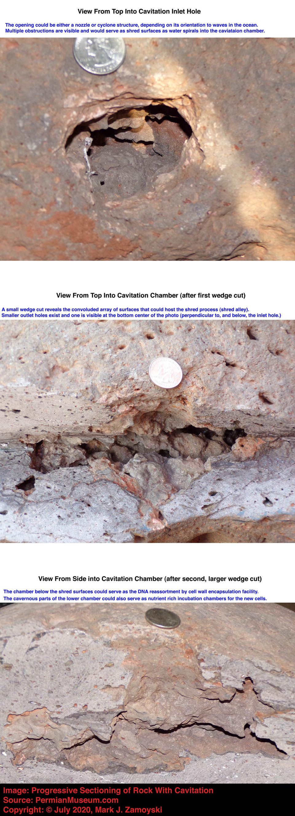2) The part of Arizona where the meteorite fell was a shallow ocean at the time, which provides the movement of water containing the prokaryotic cells (1 mil/ml), allowing CSFF structures to shred them and create DNA reassorted eukaryotic cells. The unused shredded material becomes a nutrient rich environment (like an egg) that allows the reassorted cells to thrive.