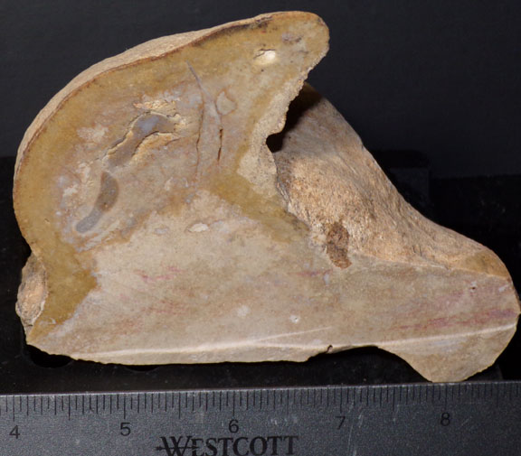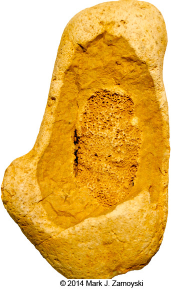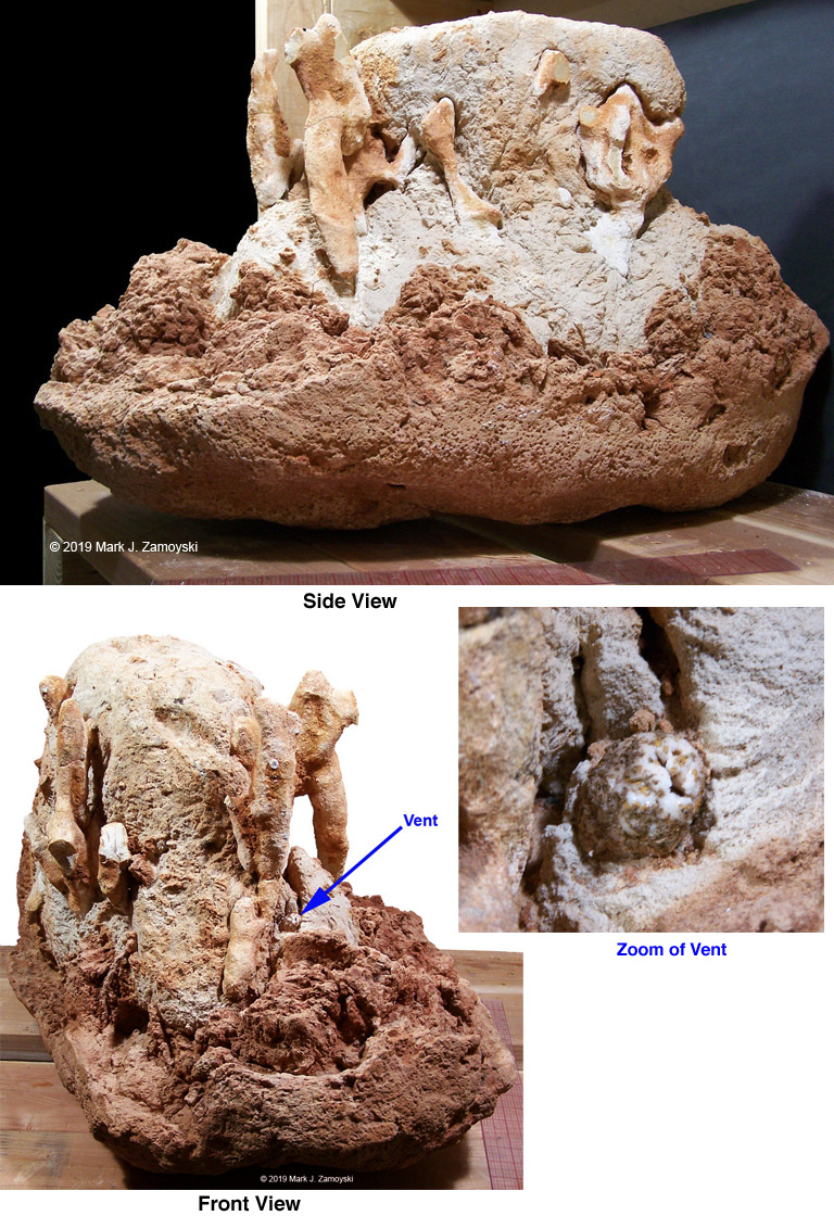 In the side view, the red, avocado shaped bowl at the very bottom is limestone that has been stained by iron that infiltrated from the lava below. Rotating the coral colony rock counterclockwise (front view) reveals a thermal vent. A zoom in on the vent reveals that it is composed of the crystalline form of calcium carbonate, but the rest of the rock is not. Just to the right of the vent, the calcium carbonate is much denser than in other parts of the rock, and it somewhat resembles cement. As will be covered later, external features of some of our fossils are sometimes preserved in the density of the calcium carbonate matrix.