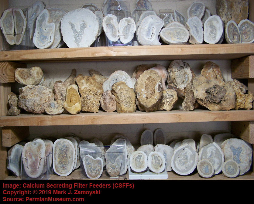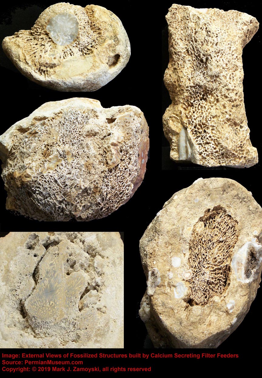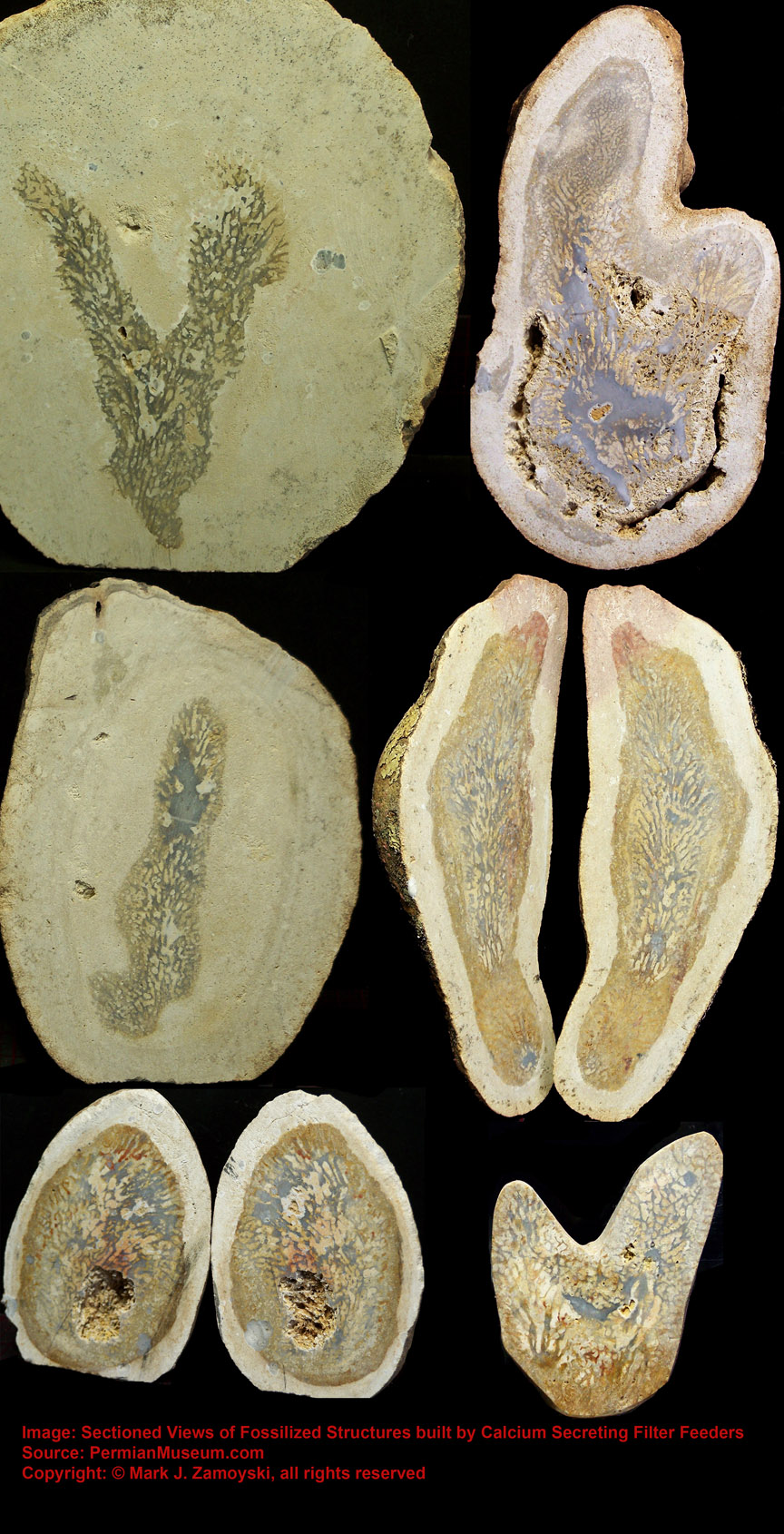 The Permian coastal ocean floor was covered with hard skeleton labyrinth structures built by single celled organisms called Calcium Secreting Filter Feeders (CSFFs).