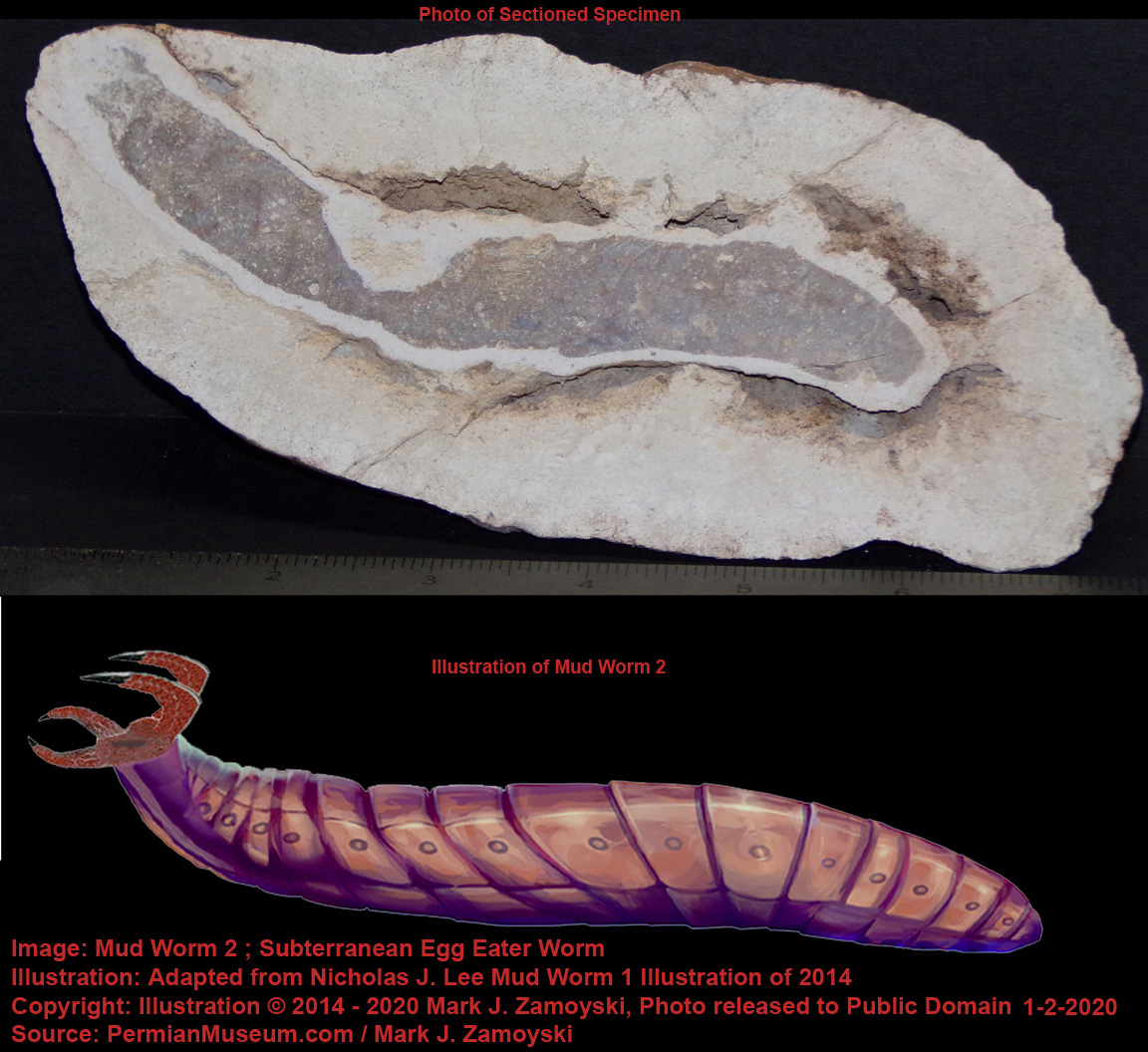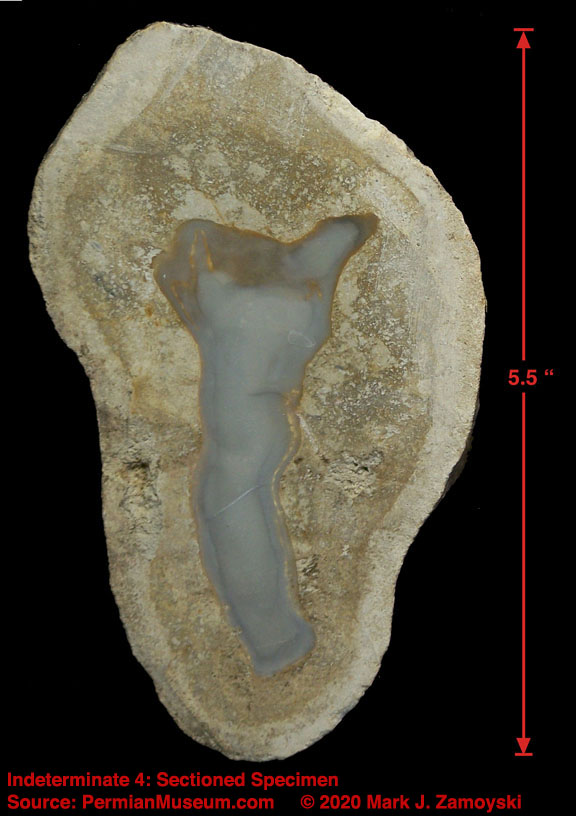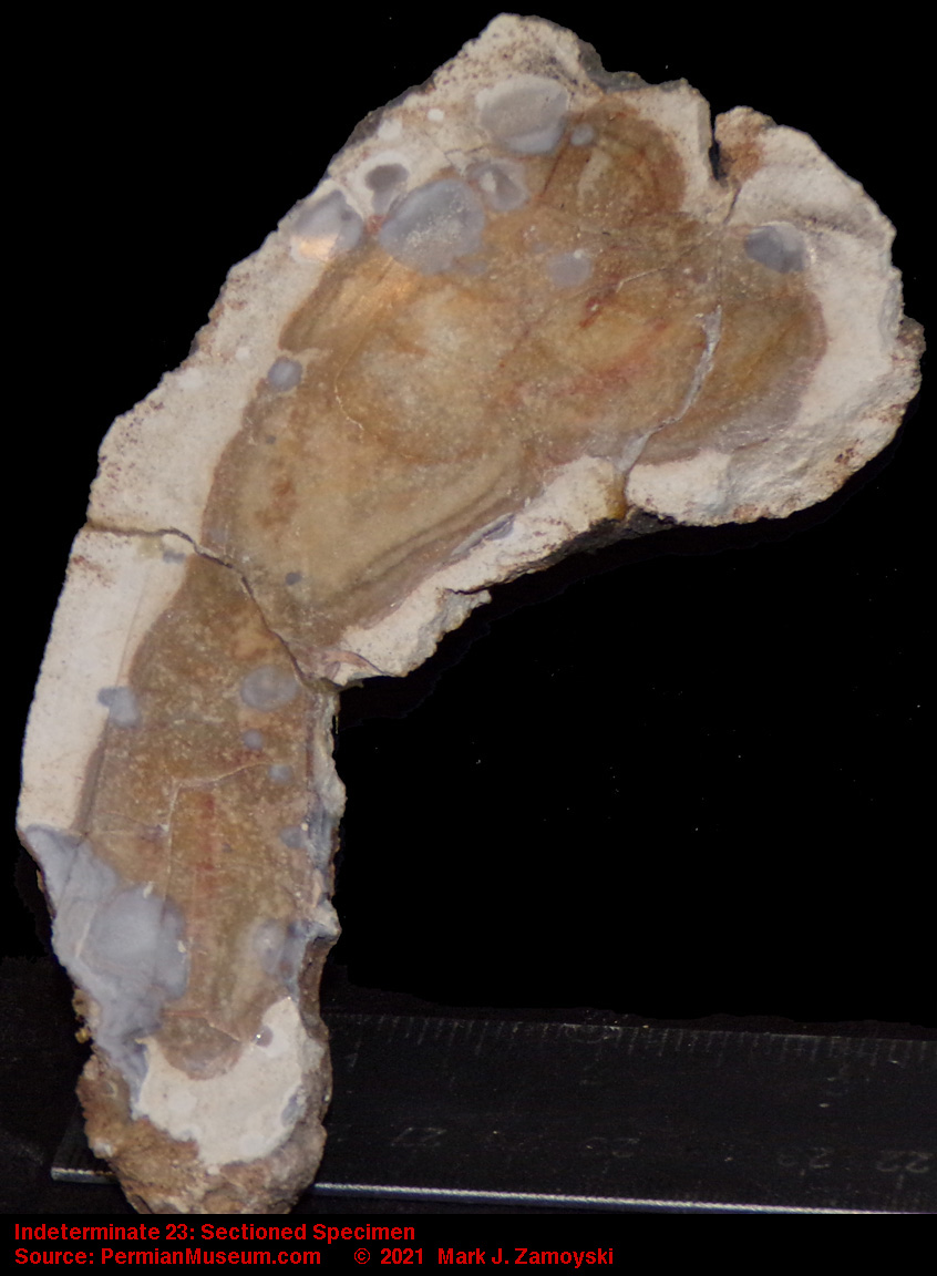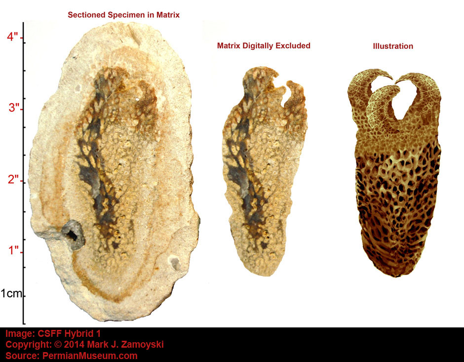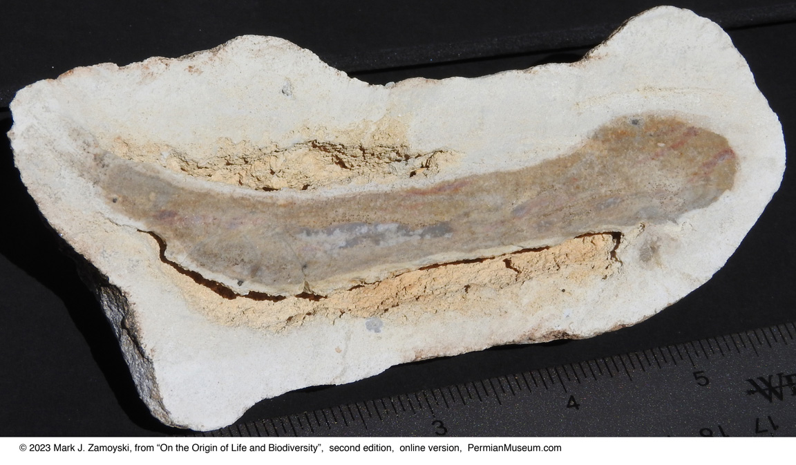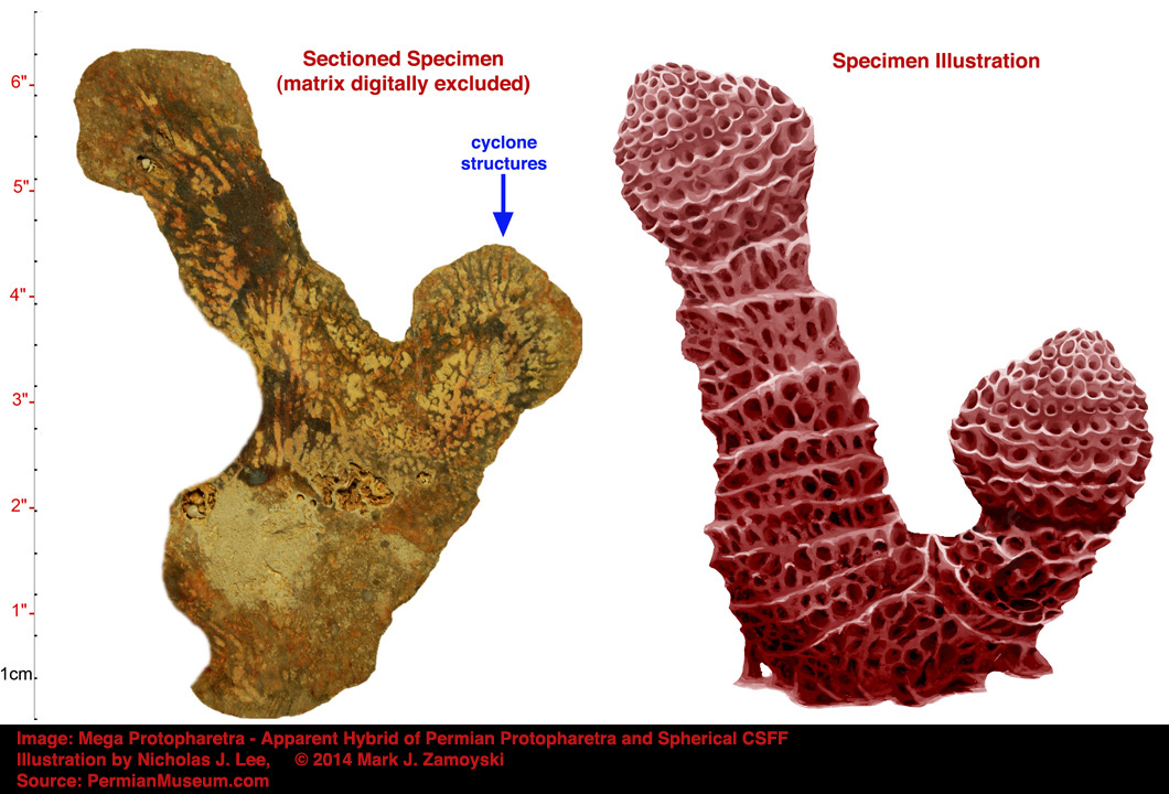 Author is extremely grateful to Dr. James T. Sprinkle of the University of Texas at Austin, who took the time to look at the picture and identify a potential Cambrian counterpart. A smaller version of the specimen above first appears in the fossil record around 500 ma at the start the Cambrian Explosion of Life (Boardman, Fossil Invertebrates, 1987, p.114 Figs. A and B ) and was called a Protopharetra. It appears here again during the Permian Explosion of Life, and author has named this larger version the Permian Protopharetra.