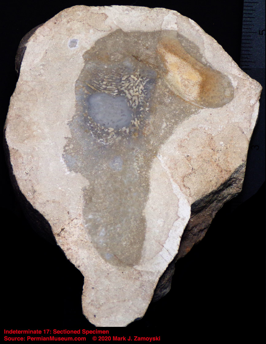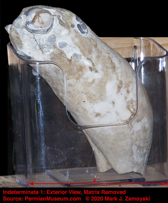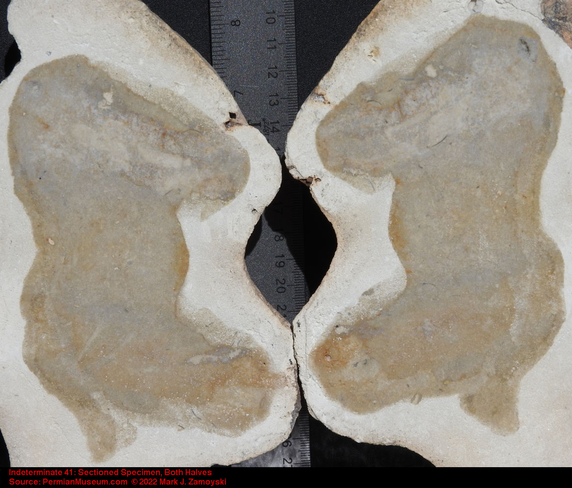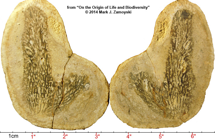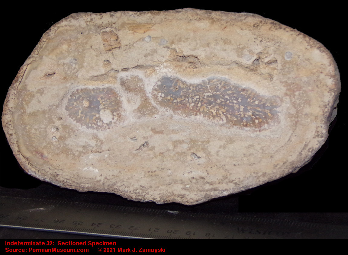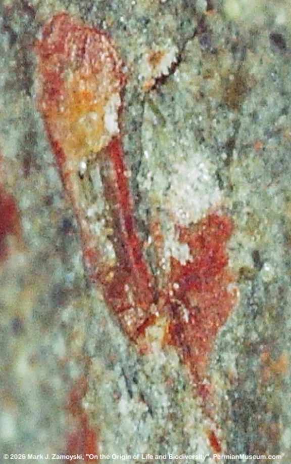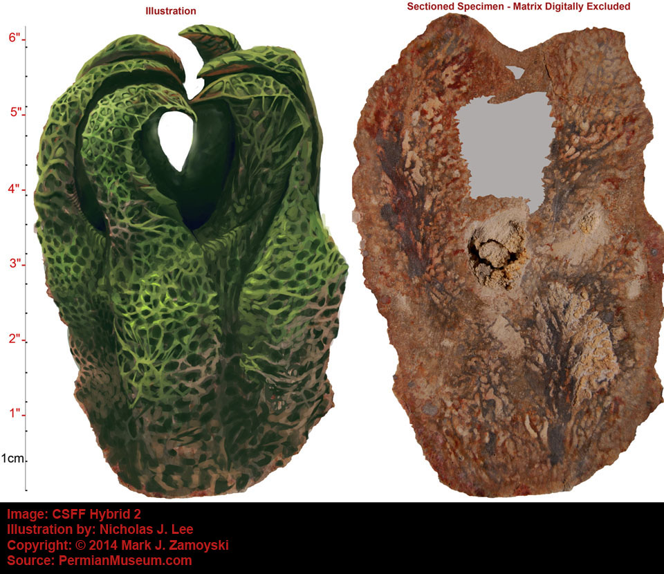 Author is extremely grateful to Dr. James T. Sprinkle of the University of Texas at Austin, who took the time to look at the picture and identify a potential Cambrian counterpart. A smaller version of the specimen above first appears in the fossil record around 500 ma at the start the Cambrian Explosion of Life (Boardman, Fossil Invertebrates, 1987, p.114 Figs. A and B ) and was called a Protopharetra. It appears here again during the Permian Explosion of Life, and author has named this larger version the Permian Protopharetra.