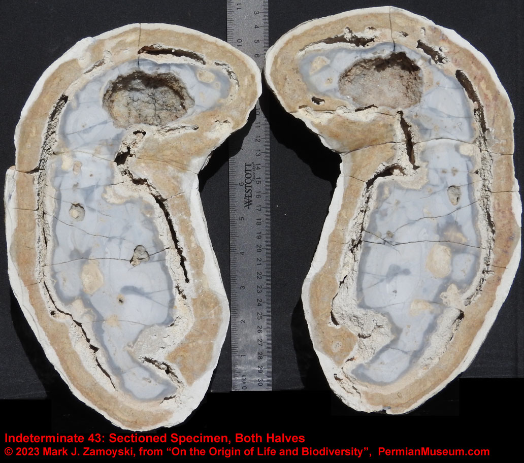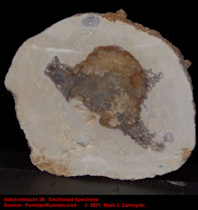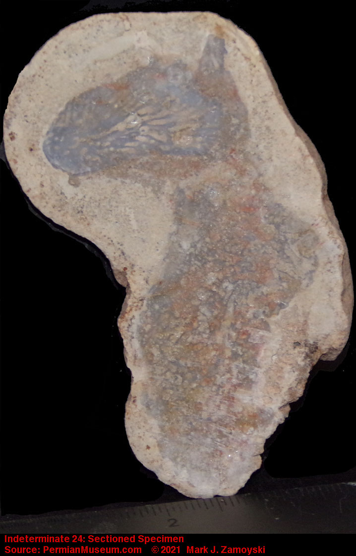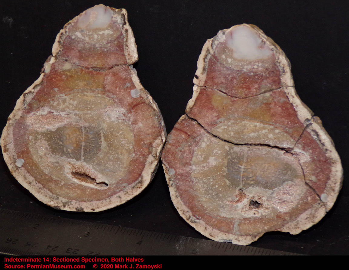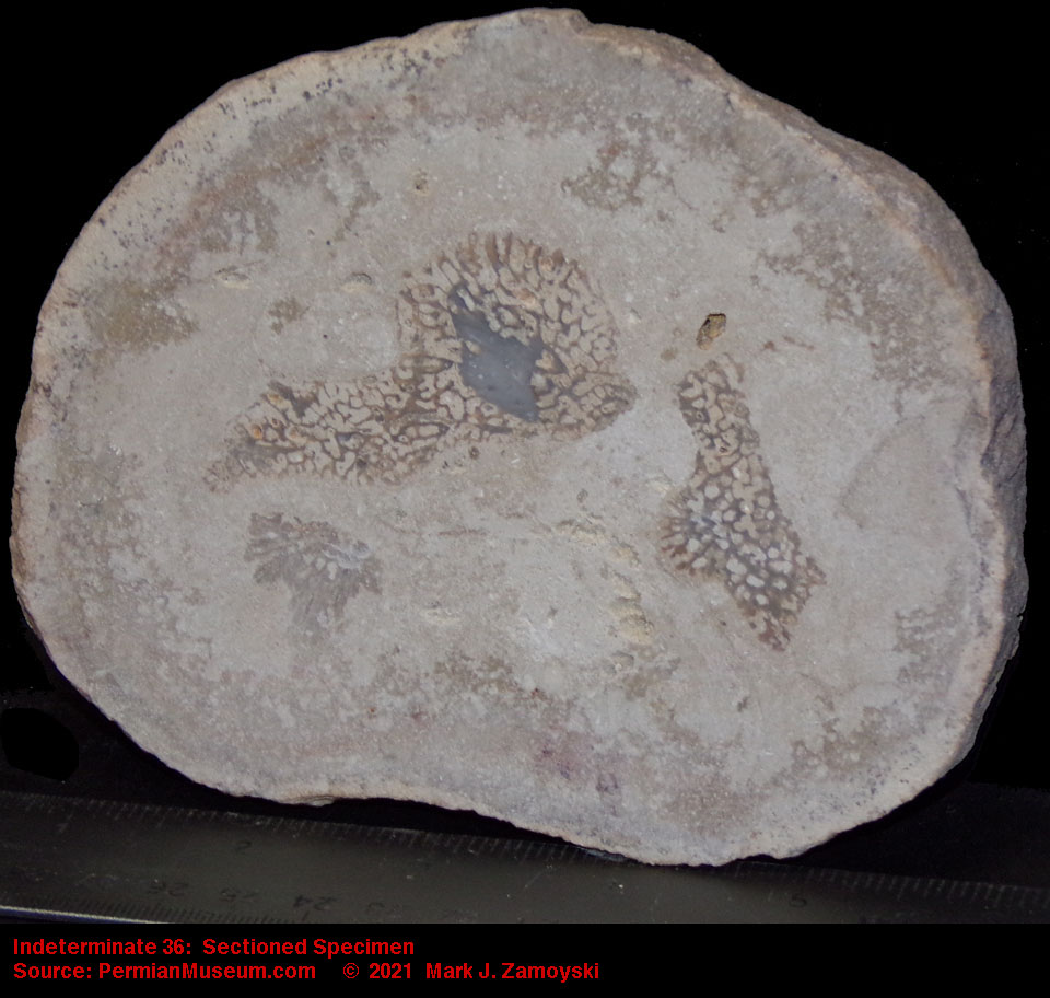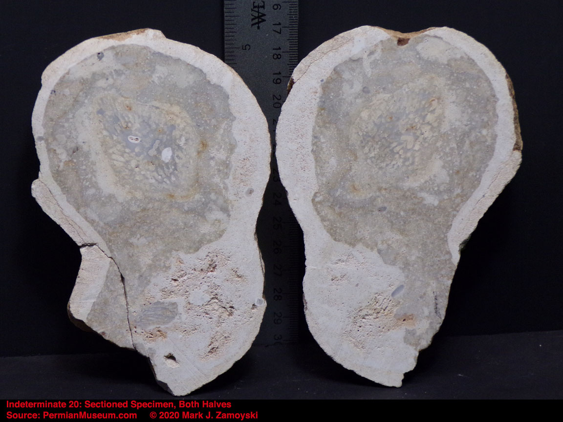 Author is extremely grateful to Dr. James T. Sprinkle of the University of Texas at Austin, who took the time to look at the picture and identify a potential Cambrian counterpart. A smaller version of the specimen above first appears in the fossil record around 500 ma at the start the Cambrian Explosion of Life (Boardman, Fossil Invertebrates, 1987, p.114 Figs. A and B ) and was called a Protopharetra. It appears here again during the Permian Explosion of Life, and author has named this larger version the Permian Protopharetra.