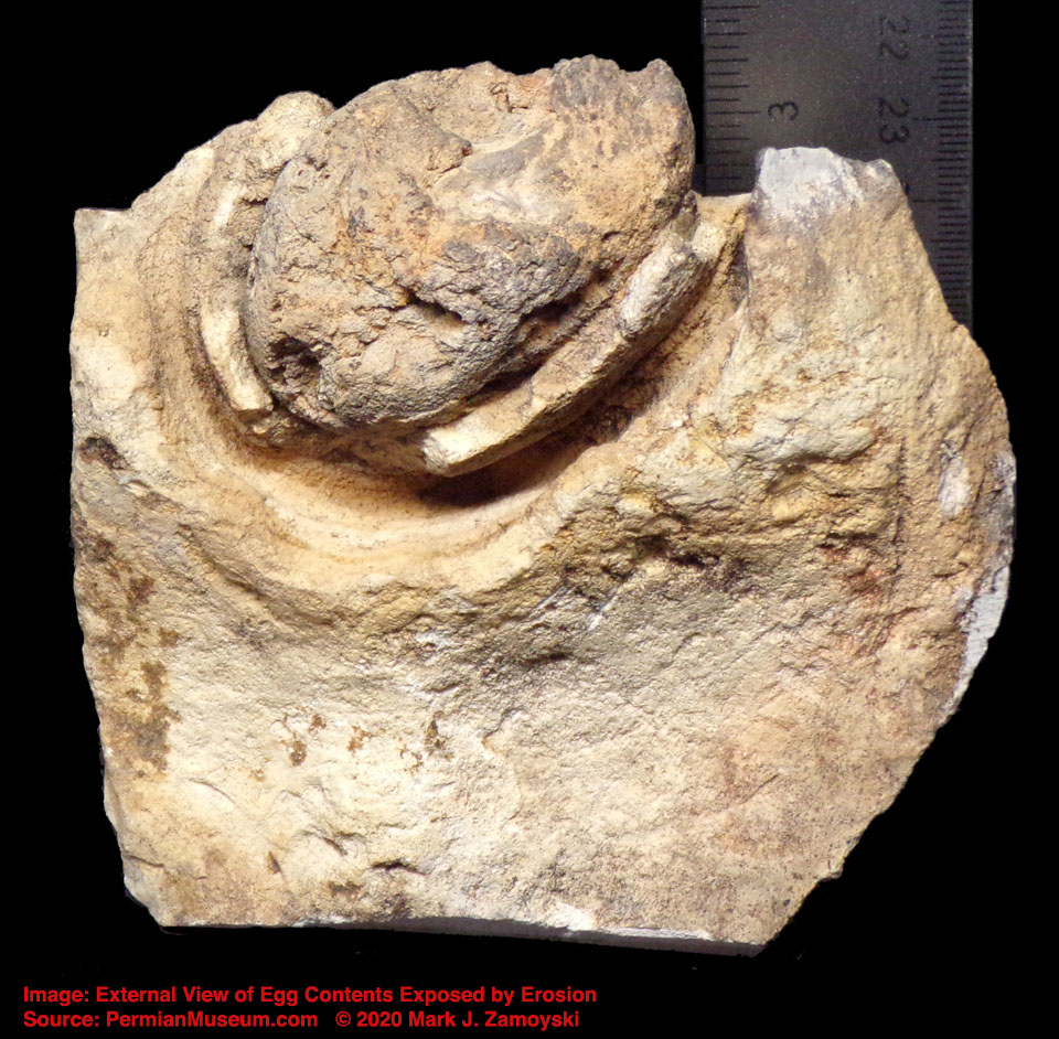 The example below shows the external view of an egg that has been eroded to reveal the egg shell and contents inside.