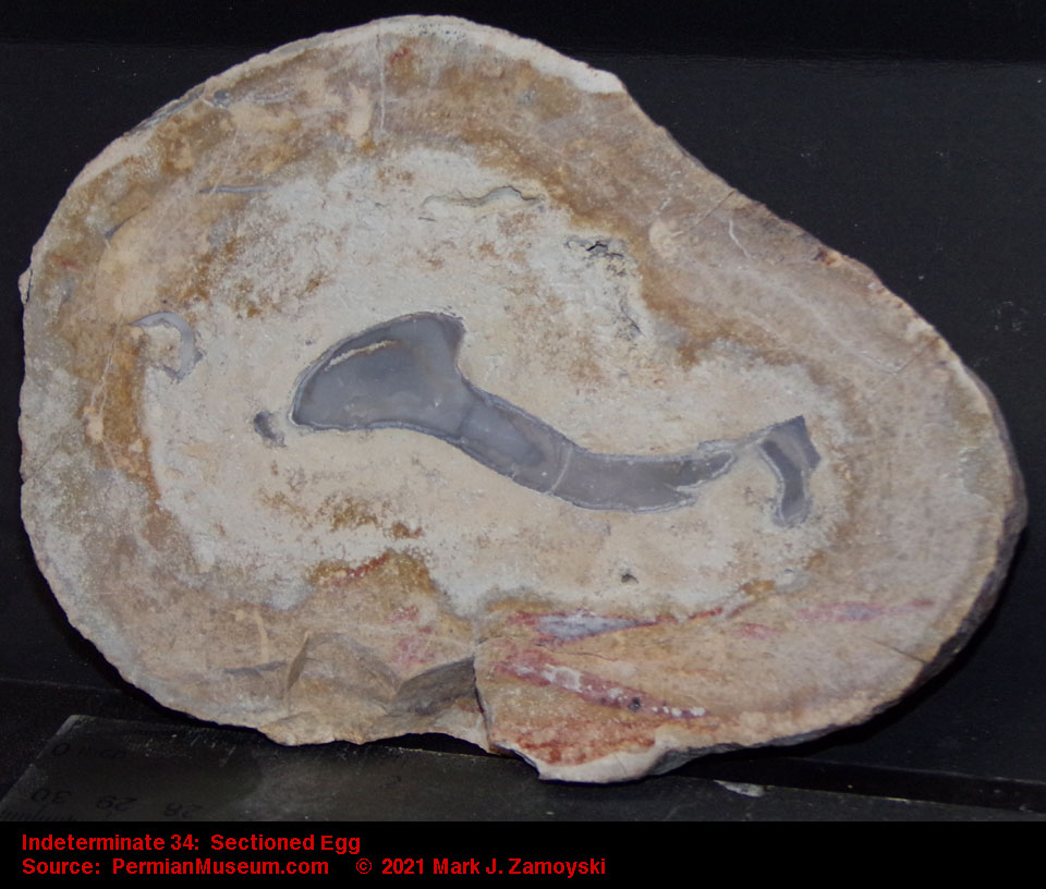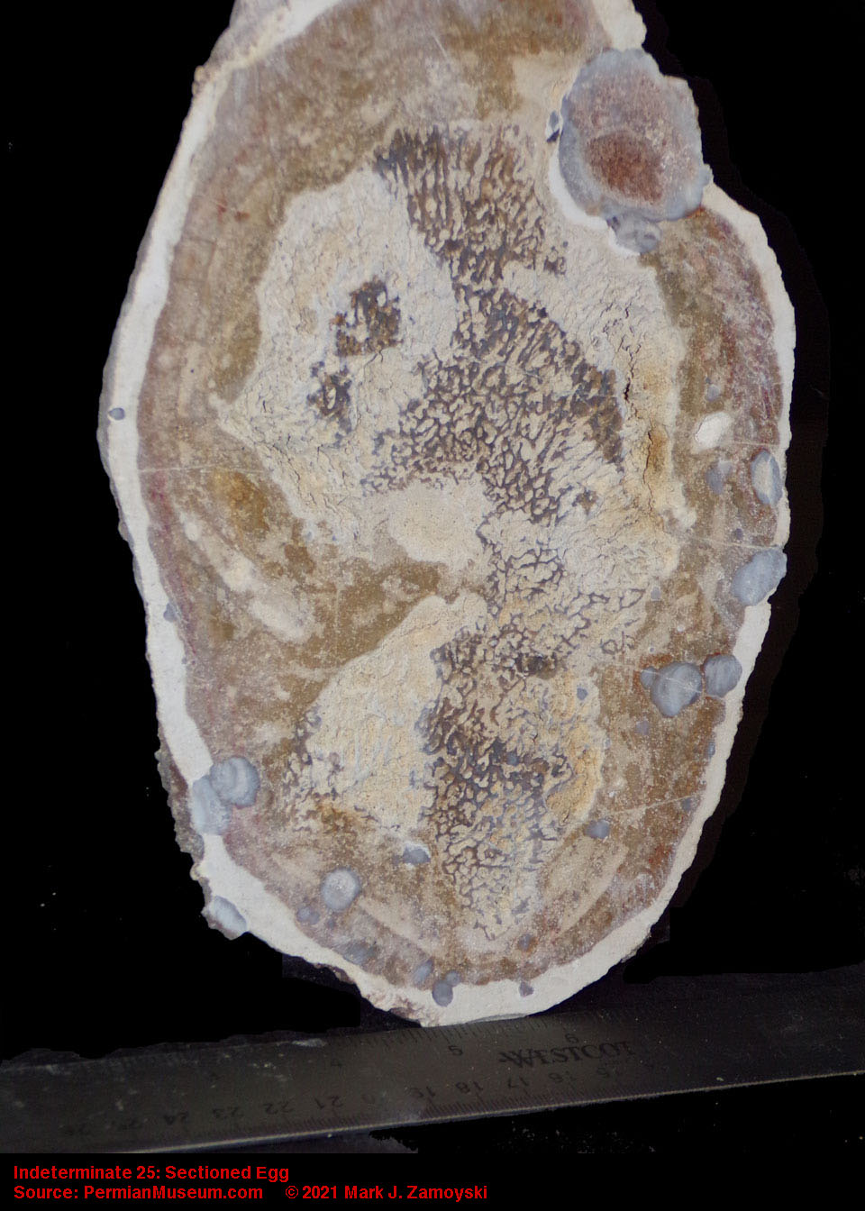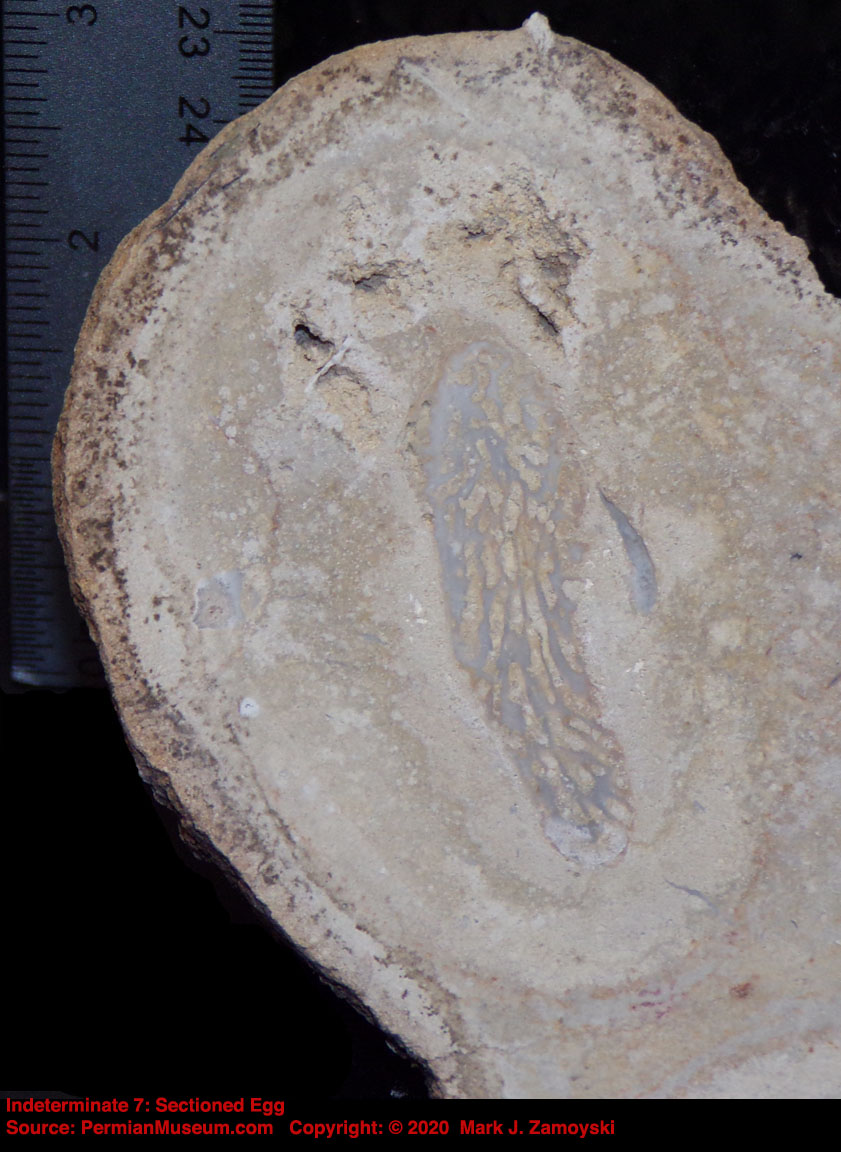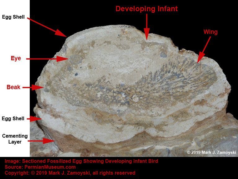 Sectioned fossilized eggs provide an excellent view of developing life forms within. There are several attributes we use to identify fossilized eggs: 1) the fossil is the shape of an egg (oval or circular), 2) an egg shell is often visible at the periphery in the sectioned specimen, 3) if there is a developing life form inside, there is often a surrounding calcium powder filled space around the life form as the egg yolk has been consumed and 4) the egg shaped fossil is often attached to a substrate, and found with other eggs and life forms in proximity.