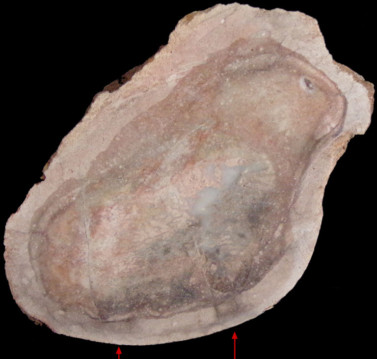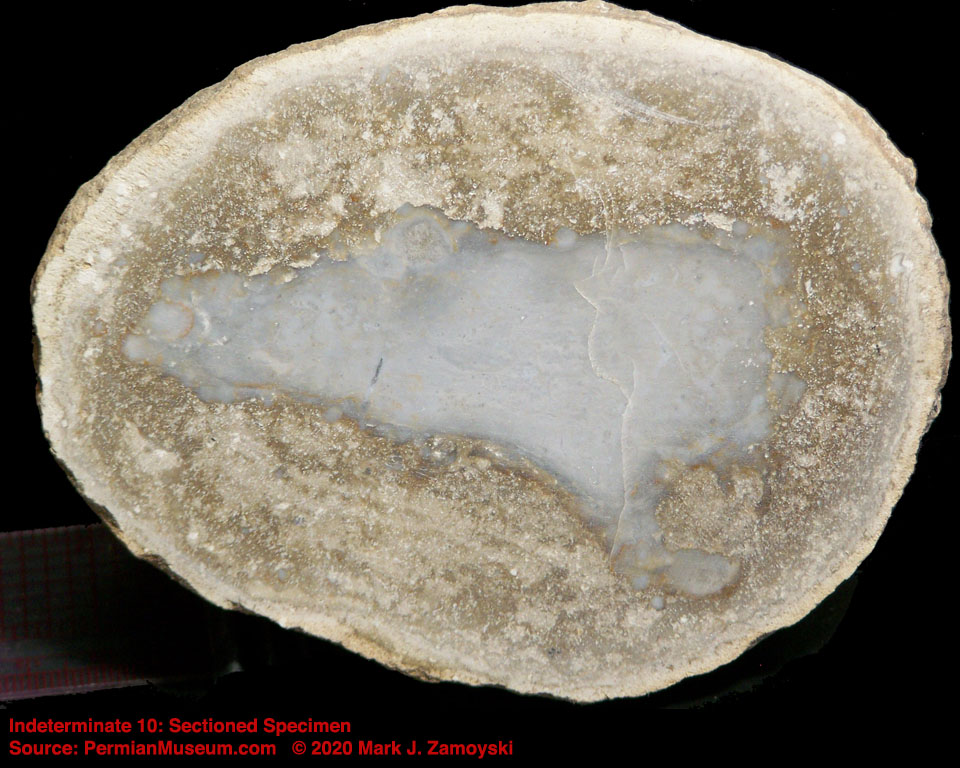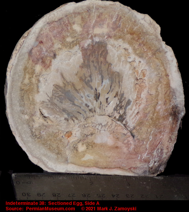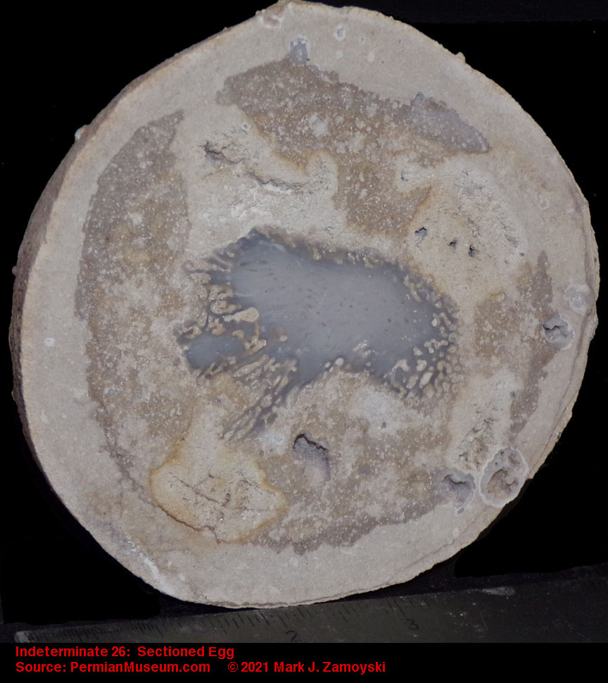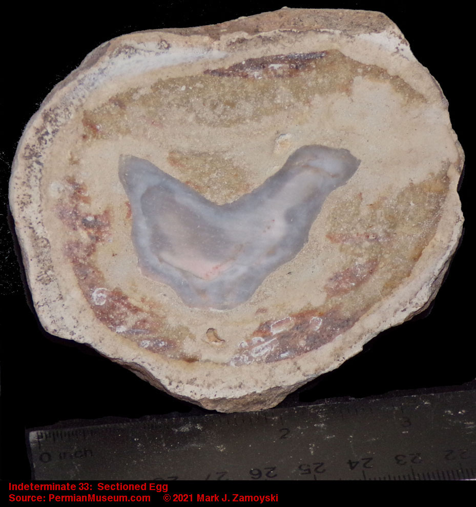 Sectioned fossilized eggs provide an excellent view of developing life forms within. There are several attributes we use to identify fossilized eggs: 1) the fossil is the shape of an egg (oval or circular), 2) an egg shell is often visible at the periphery in the sectioned specimen, 3) if there is a developing life form inside, there is often a surrounding calcium powder filled space around the life form as the egg yolk has been consumed and 4) the egg shaped fossil is often attached to a substrate, and found with other eggs and life forms in proximity.