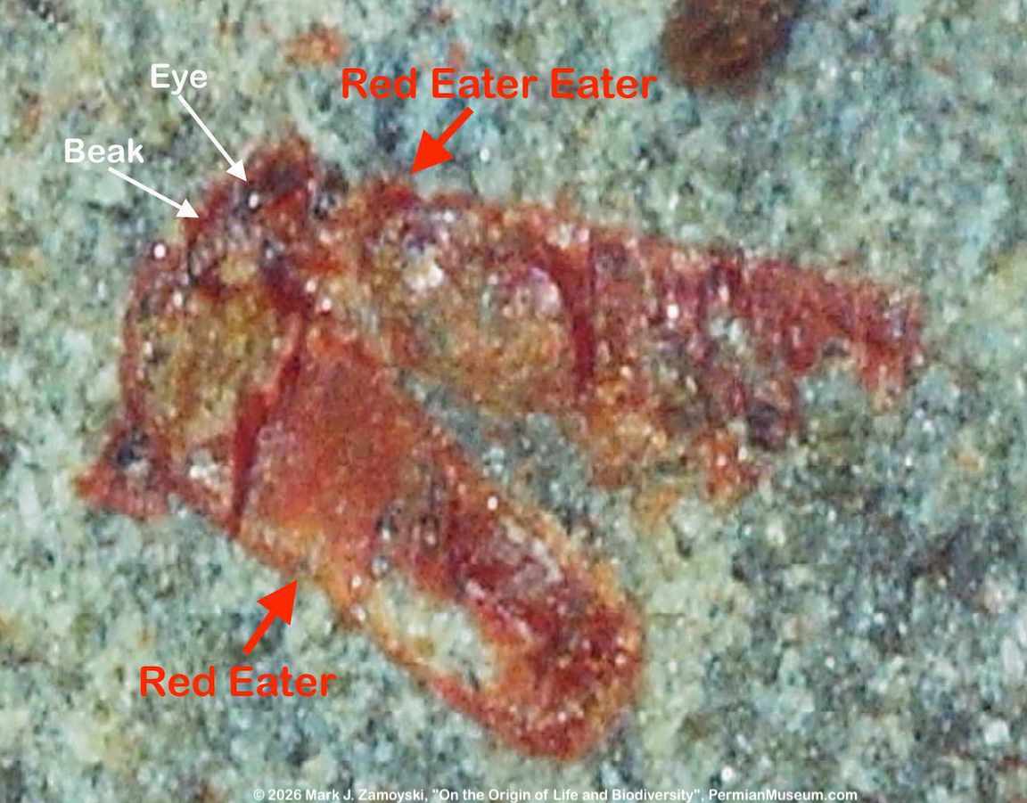 The Red Eaters also include a type that appears to eat other Red Eaters. The Red Eater Eater appears on top in the photo below, appears to have a squid like beak, and appears to be eating the red eater below it. The red eater below appears to already have had some bites taken out near its rear.