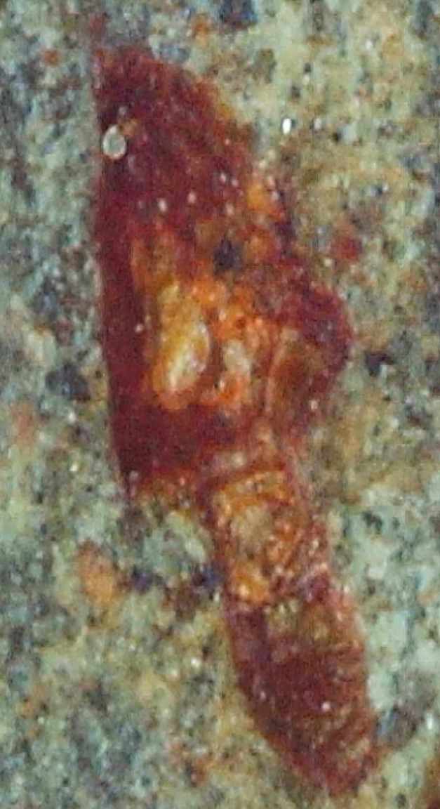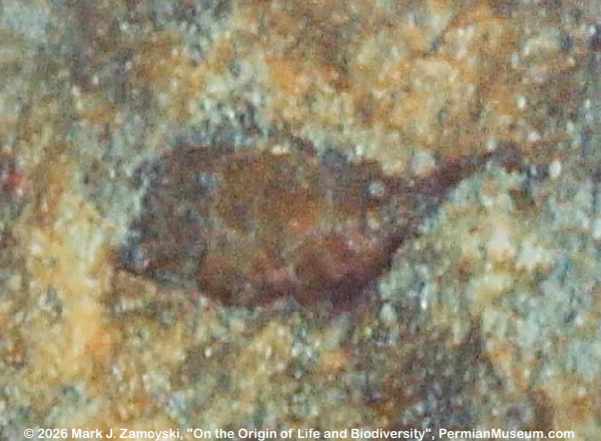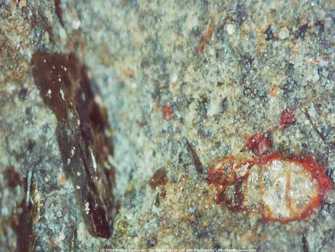 The rock was on earth for 250 - 300 million years, so it is possible that indigenous microscopic earth life forms, 1000 X smaller, but morphologically identical to their larger counterparts on earth, inhabited the surface of the rock, and at some point were immaculately preserved by a instantaneous fossilization event. However, the probability is extremely small. Add to that the ecosystem itself seen on the rock, which includes 10 legged beaked spiders, 3 fingered rodents, treeless fruit that grows directly from the ground, and life forms that eat and accumulate metal, etc , and the probability that the life forma are terrestrial is infinitesimal.