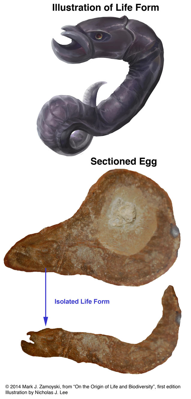 The next example is a sectioned egg that shows an indeterminate life form inside that has eaten part of the yolk, which leaves a space surrounding the life form.