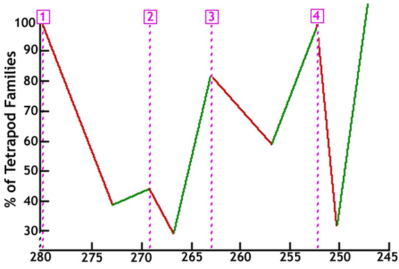 The below graphic depicts these pulses for terrestrial tetrapods, based on data published by Sahney and Benton (Sahney, S and Benton M. J., Recovery from the most profound mass extinction of all time, Proceedings of the Royal Society B, 275, 759 - 765 , 2008)