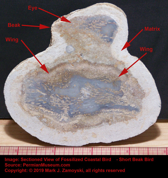 A sectioned specimen of a small bird like life form shows the same crystallization pattern, with the life form entombed in a calcium carbonate matrix. Interestingly, the life form appears to be glancing back a something that caught its attention, just before being turned to stone. This is consistent with the visible component of the high energy release associated with the death by limestone fossilization event, as described by the survivors that were protected by trees.